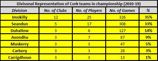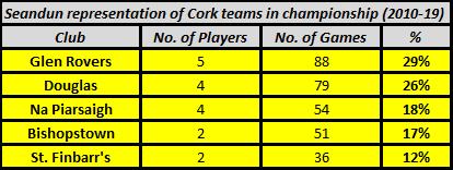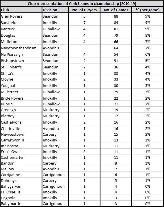 Outside of the traditional powerhouses within the City / East duopoly, only Kanturk and Newtownshandrum have produced more than one Cork hurler this decade. The Duhallow club’s rise through the divisions has been backboned by intercounty players, with Anthony Nash, Aidan Walsh and Lorcan McLoughlin amassing 80 appearances between them. In the south east of the county, despite the presence of Ballymartle, Ballinhassig and Courcey Rovers at the upper echelons of the club game, no Carrigdhoun player started a championship game for Cork; Rob O’Shea (Carrigaline), Darren McCarthy (Ballymartle) and Stephen White (Ballygarvan) accruing 13 appearances between them from the bench. Carbery and Muskerry have contributed three players each while outside of Newtonshandrum, only Darragh Fitzgibbon (Charleville) and Cormac Murphy (Mallow) have emerged from the Avondhu constituency.